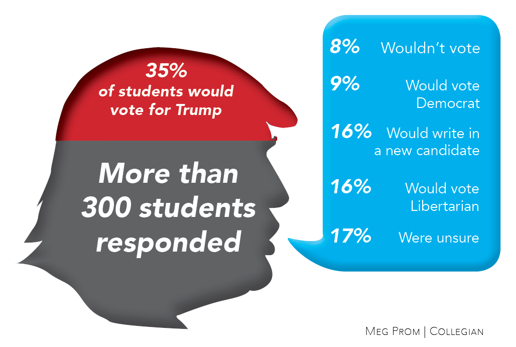 Out of more than 300 students who participated in a Collegian poll conducted this week, 25 percent plan to vote for a different party’s candidate, while 14 percent will write in another candidate rather than vote for Trump if he becomes the GOP nominee.