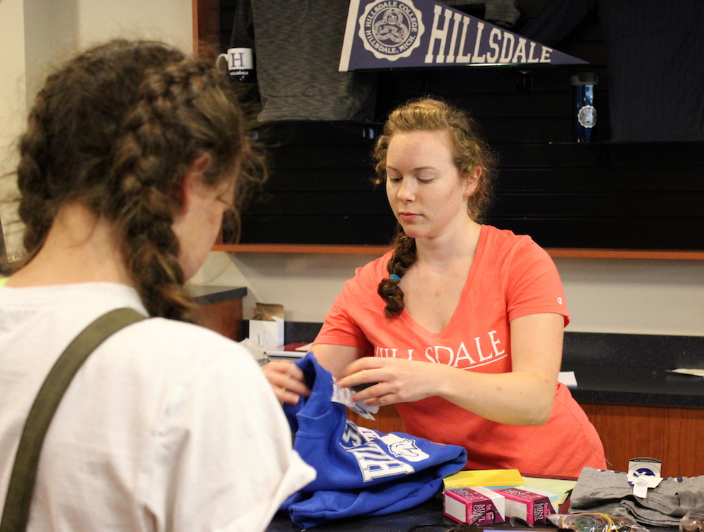 Photo: Junior Gretchen Wellemeyer manages the cash register in Hillsdale College’s bookstore. The shop has an annual revenue of $1 million and plans to double that next year. (Jordyn Pair/Collegian)