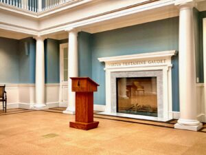 Péwé noted that among the renovations is the addition of a grand staircase that connects the lower floor to an upper mezzanine, as well as a marble fireplace with the Hillsdale College motto “virtus tentamine gaudet.”