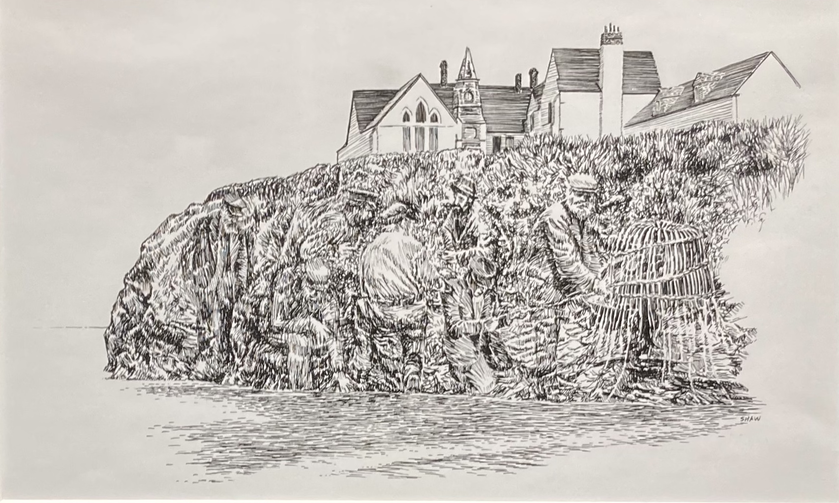 In “Truth, Goodness, Beauty,” Shaw immerses these signature Hillsdale values in an eye-catching bouquet of flowers. “Port Isaac Fishermen” tells the history of a small Cornwall town. Inspired by conversations with Port Isaac natives while he was on sabbatical there in 2011, Shaw displays “a history of fishing [is] embedded in the community.” Viewers can practically smell the sea salt as they gaze at the drawings.