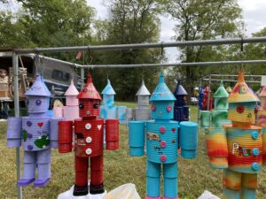 At another booth, Sarah Sechler displayed decorative men made out of tin cans. The tin men, strung on metal poles, came to life with a variety of hand-painted patterns, pictures, and slogans.