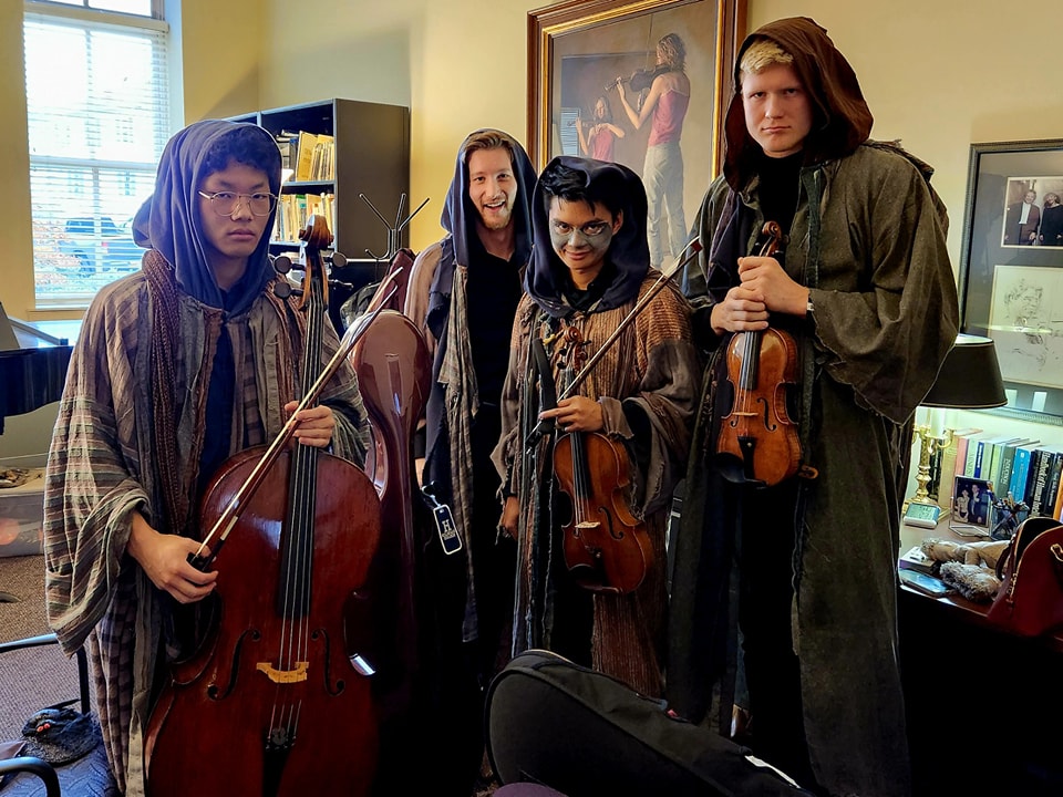 Hillsdale Academy elementary school students and members of the community packed into McNamara Recital Hall on Monday for a Halloween-themed performance by the Joy String Quartet, featuring violinists Michael Eller and Peter Kalthoff, violist Ethan Tong, and cellist Paul Trainor.