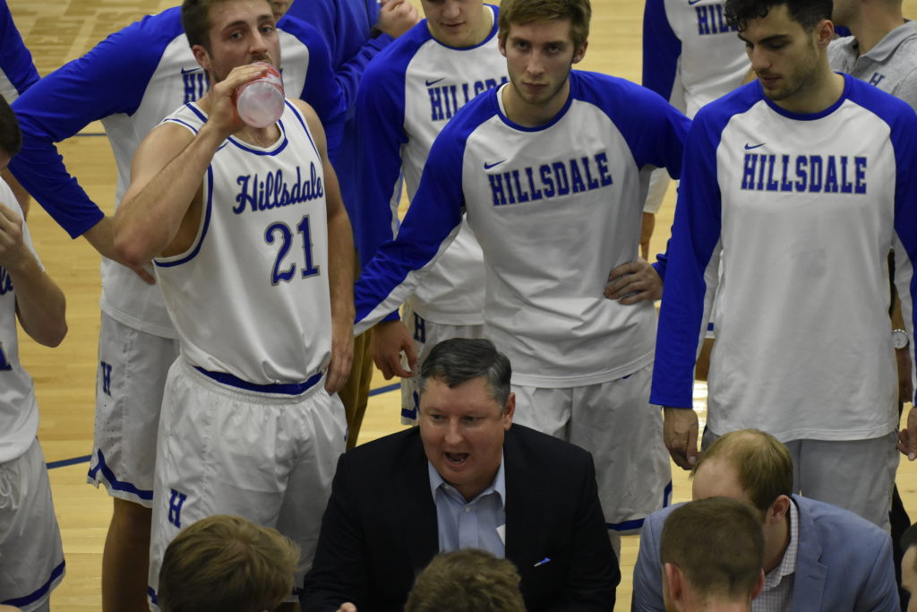 Former Hillsdale basketball head coach John Tharp instructing the team during a time out.