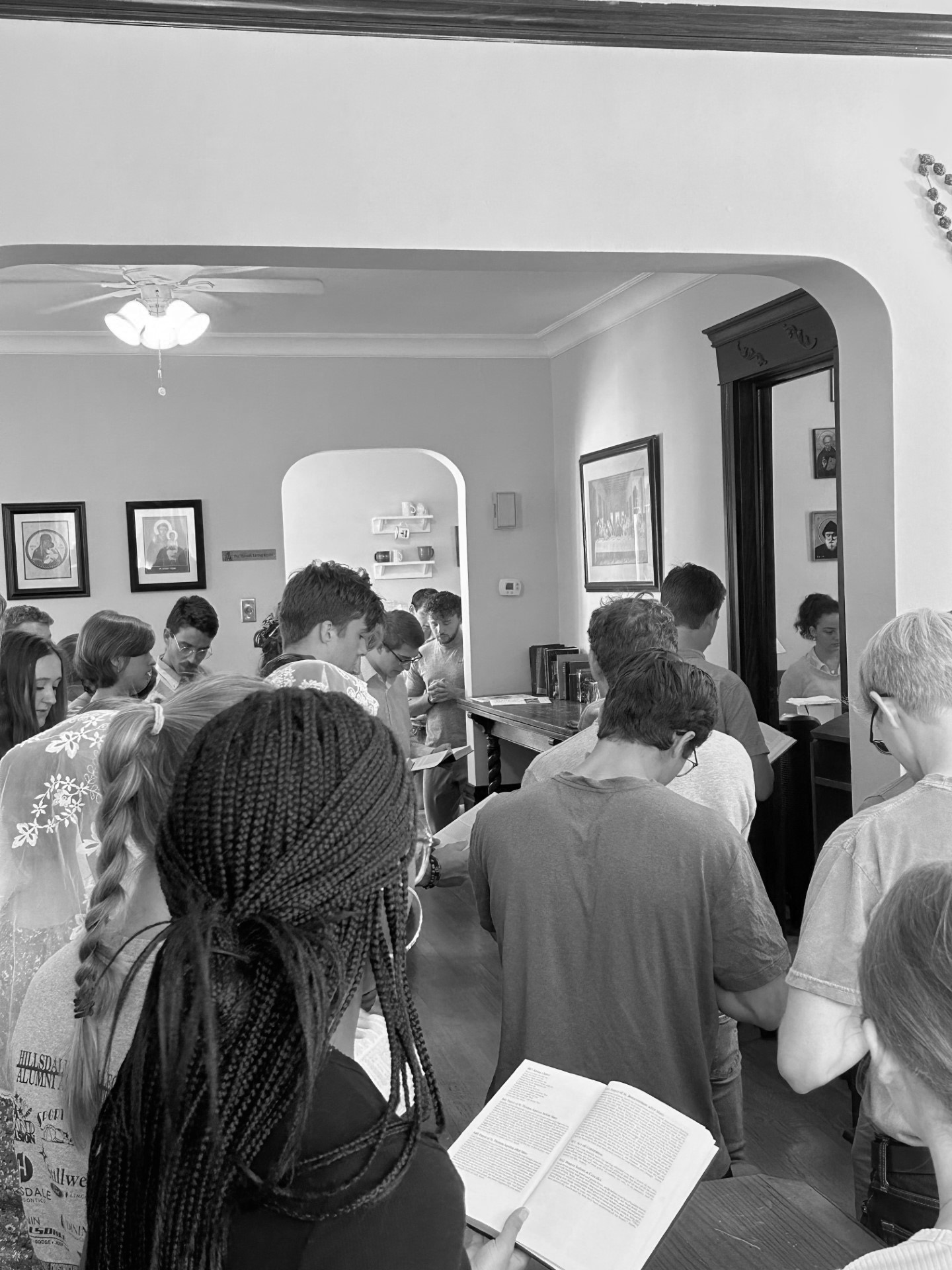 Every Thursday evening, students gather at the Grotto, St. Anthony of Padua Catholic Church’s student outreach house, for Convivium. After enjoying a home-cooked meal, they join in an opening prayer before the week’s speaker takes the stage. Students pack onto couches or vie for floor space, spilling into the kitchen and staircase when the three main rooms fill up.