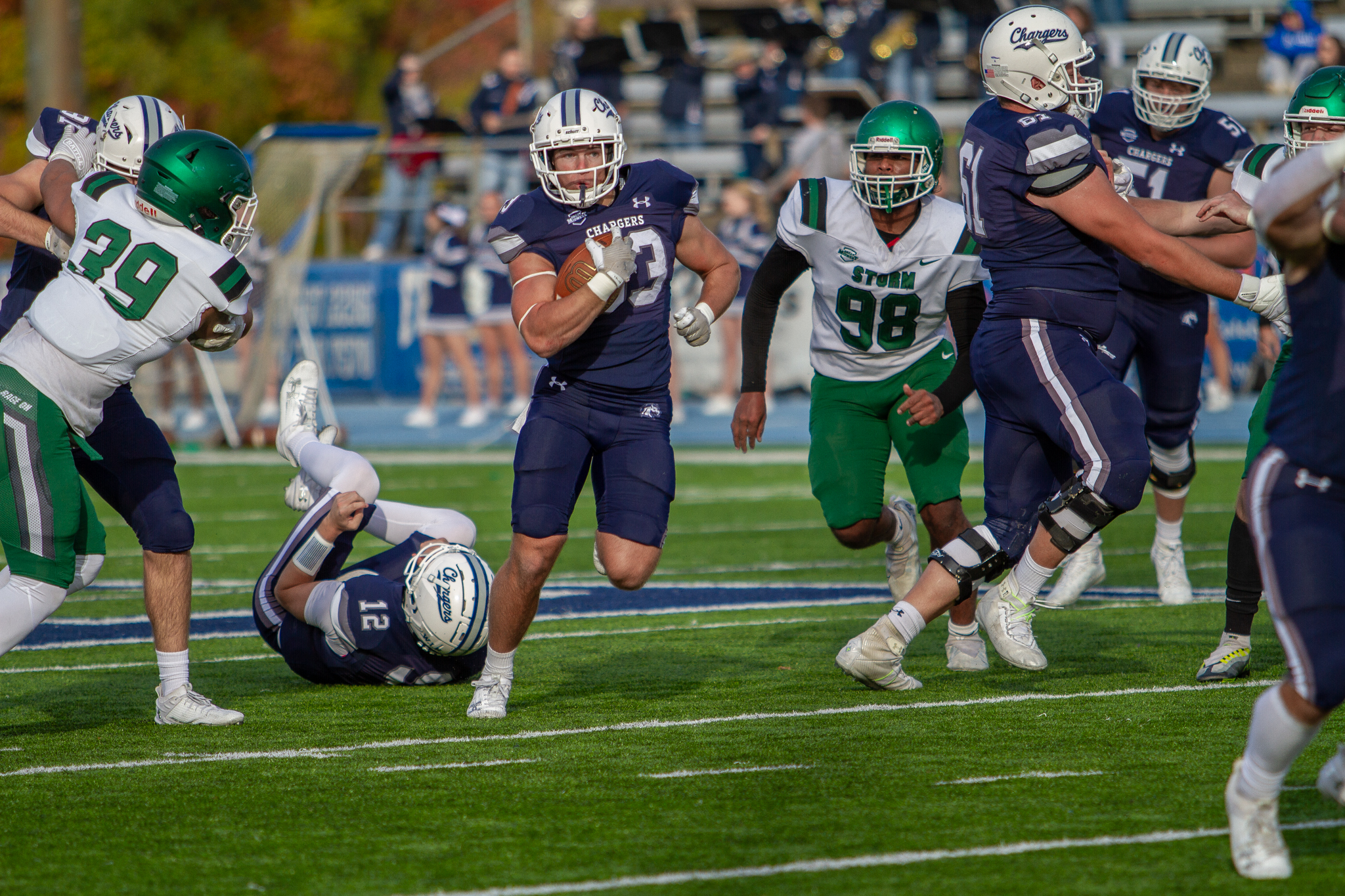 Defensively, the Chargers played their best half of football so far this season, holding Lake Erie to only seven points in the first half. The blocked punt, two fumble recoveries, and interception by junior safety Sam Zemis were some of the defensive highlights of the day. Zemis’ interception was his third on the year and his second in two games.