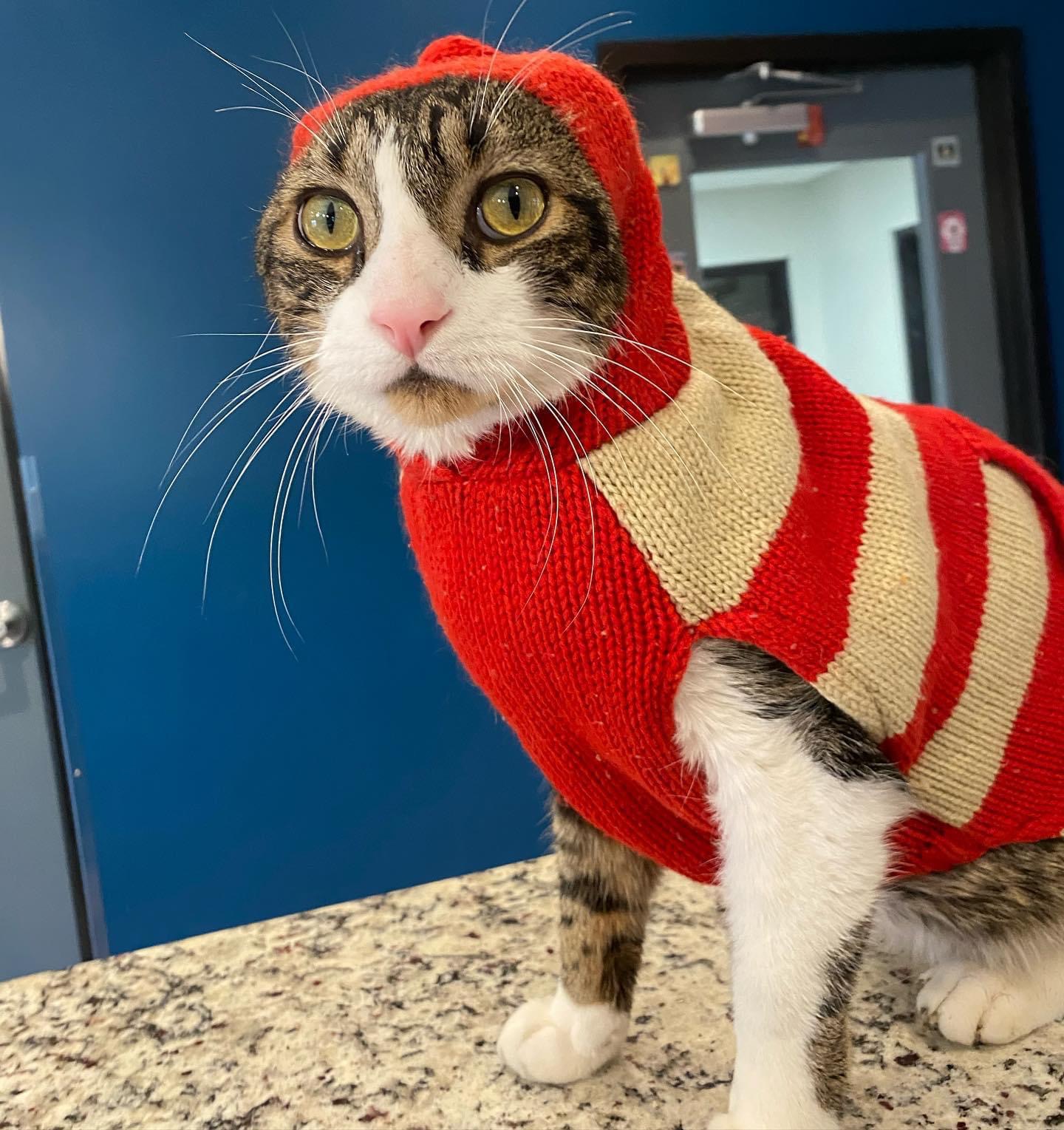Former humane society resident Eggnog dresses warm for winter. Courtesy | Facebook