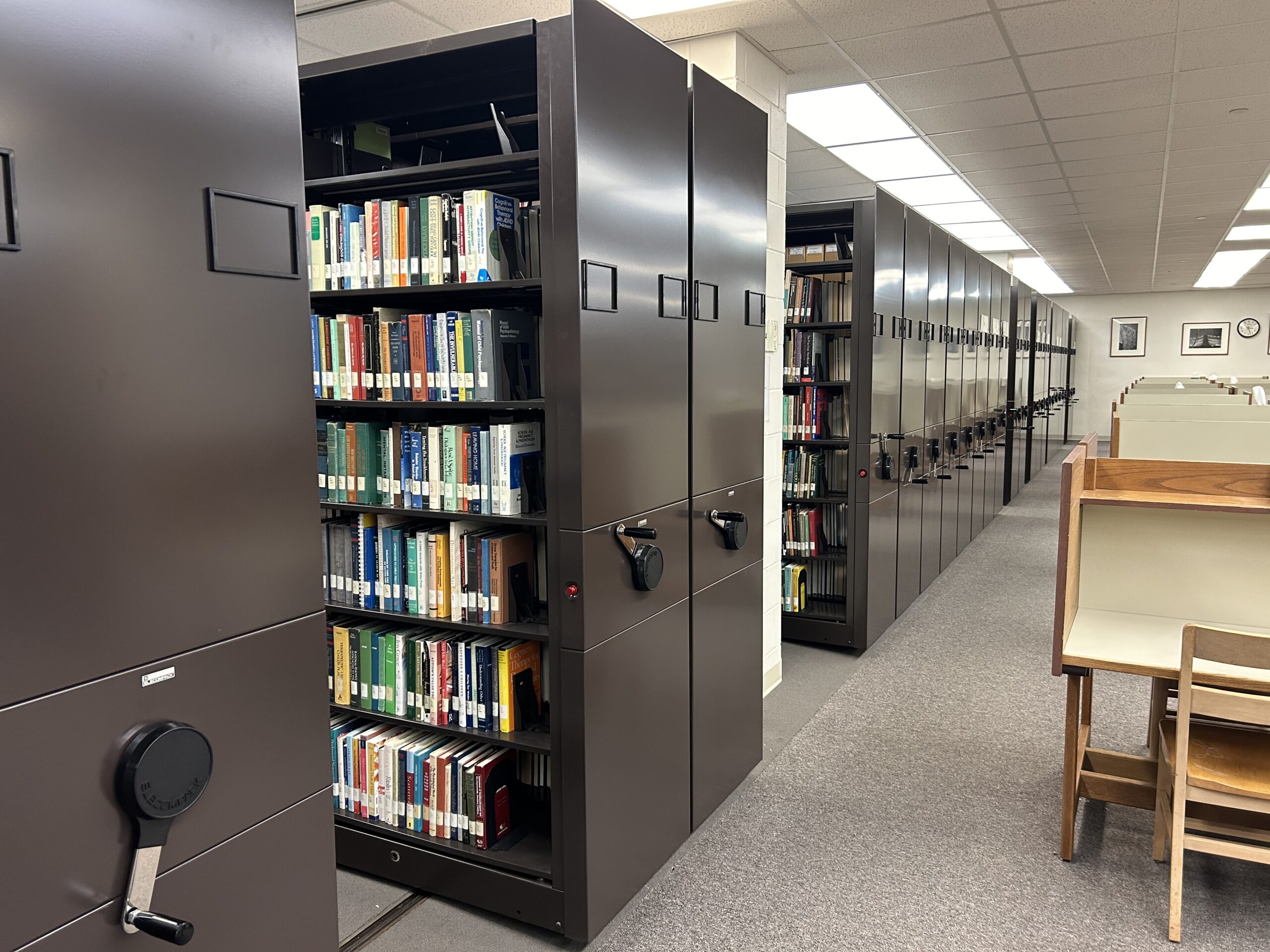 The compact shelves store books on science, bibliography, and library science as well as back issues of periodicals and archival materials, according to Public Services Librarian George Allen.