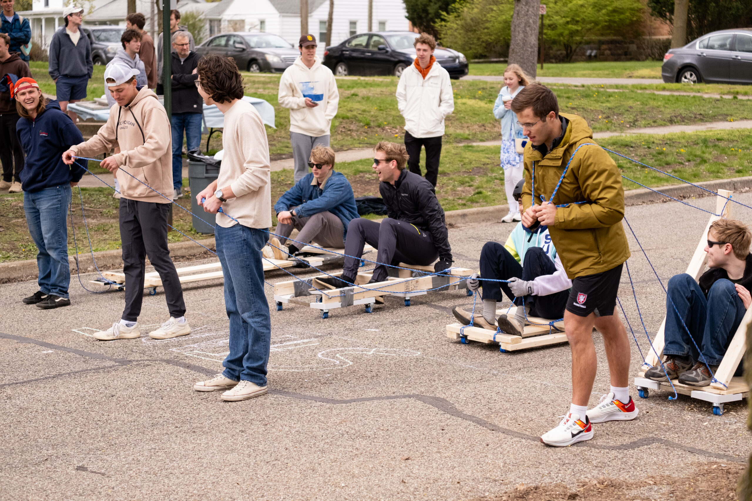 Students constructed their chariots with rolling platforms, wood, duct tape, and nails. Campus Rec kept the rules simple: teams building the chariot could be as large as students desired, but only one person could steer the chariot while one person rode the chariot in the race.