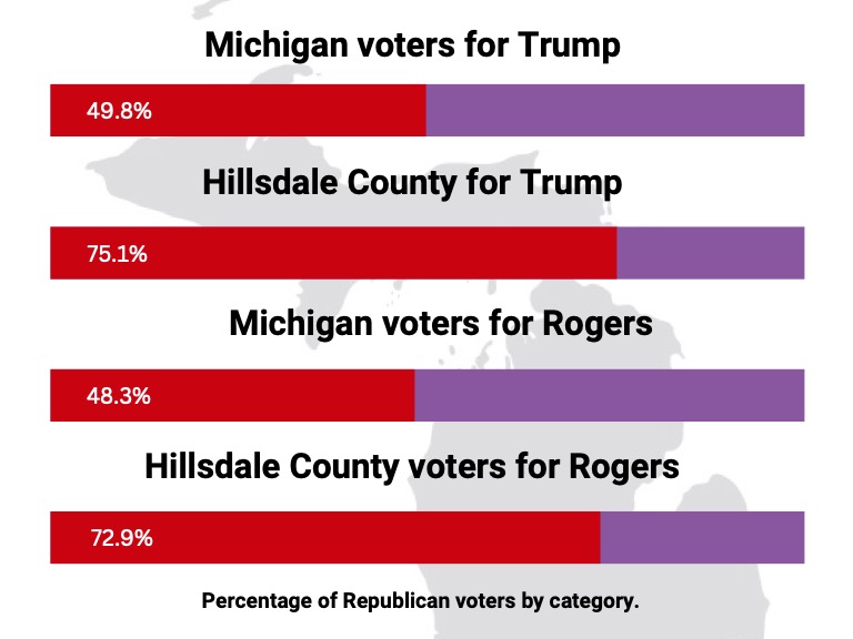 Three out of every four Hillsdale County voters supported Donald Trump on Tuesday, and the former president won Michigan’s 15 electoral votes with 49.8% of the statewide vote.