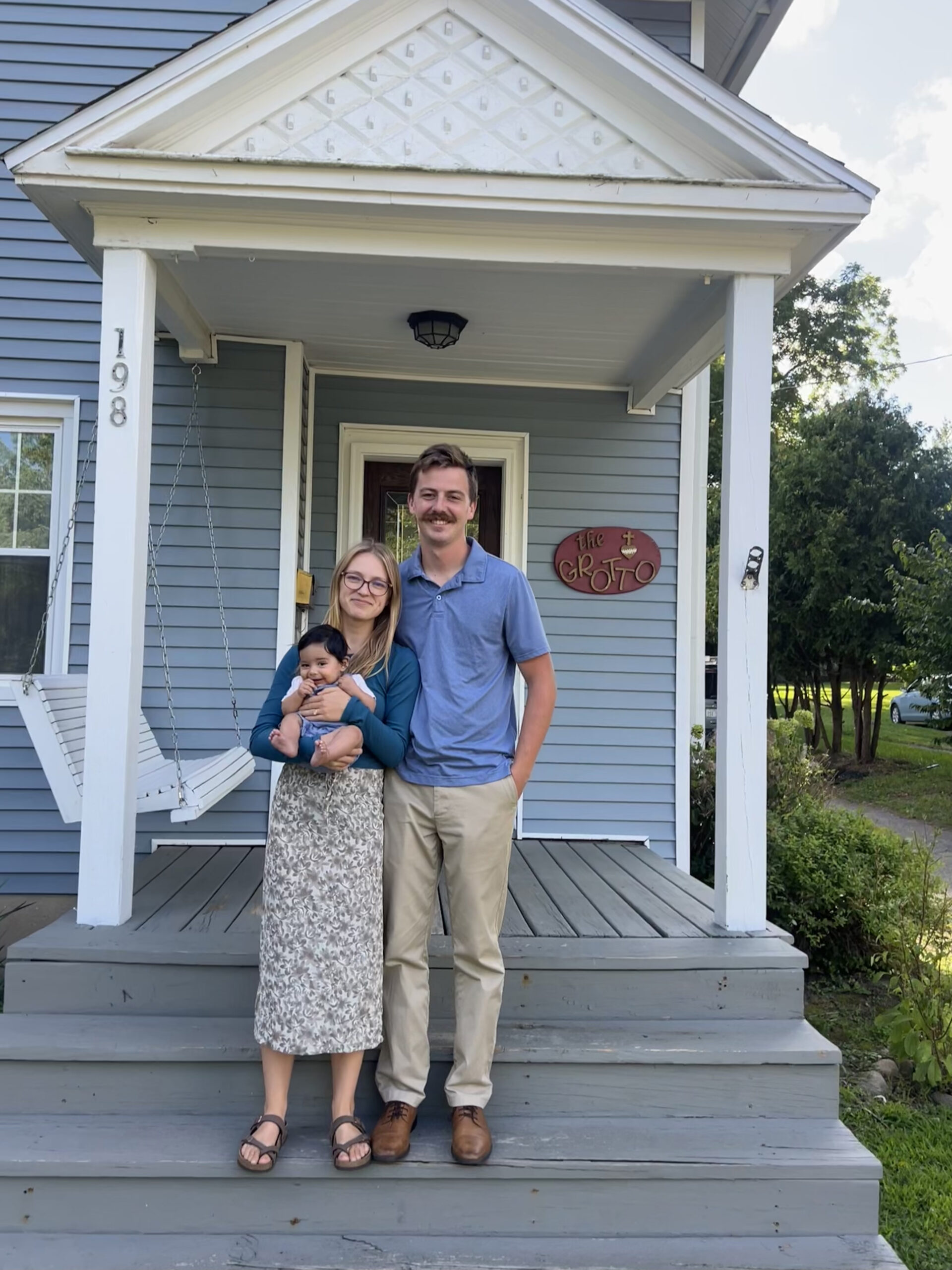 Shelby ’22 and Ben ’22 Hufford pose with their son David on the porch of the Grotto. Courtesy | Ben Hufford
