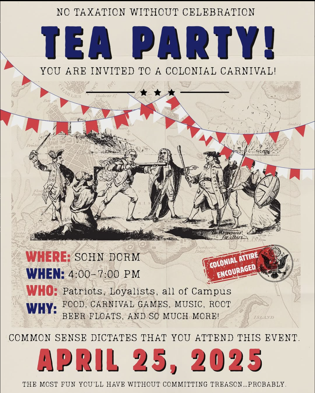 “People should be expecting free food and games,” junior and Sohn Resident Assistant Chloe Noller said. “We will have hot dogs, root beer floats, tug-of-war, and you will get to throw tea into the harbor or play cornhole.”