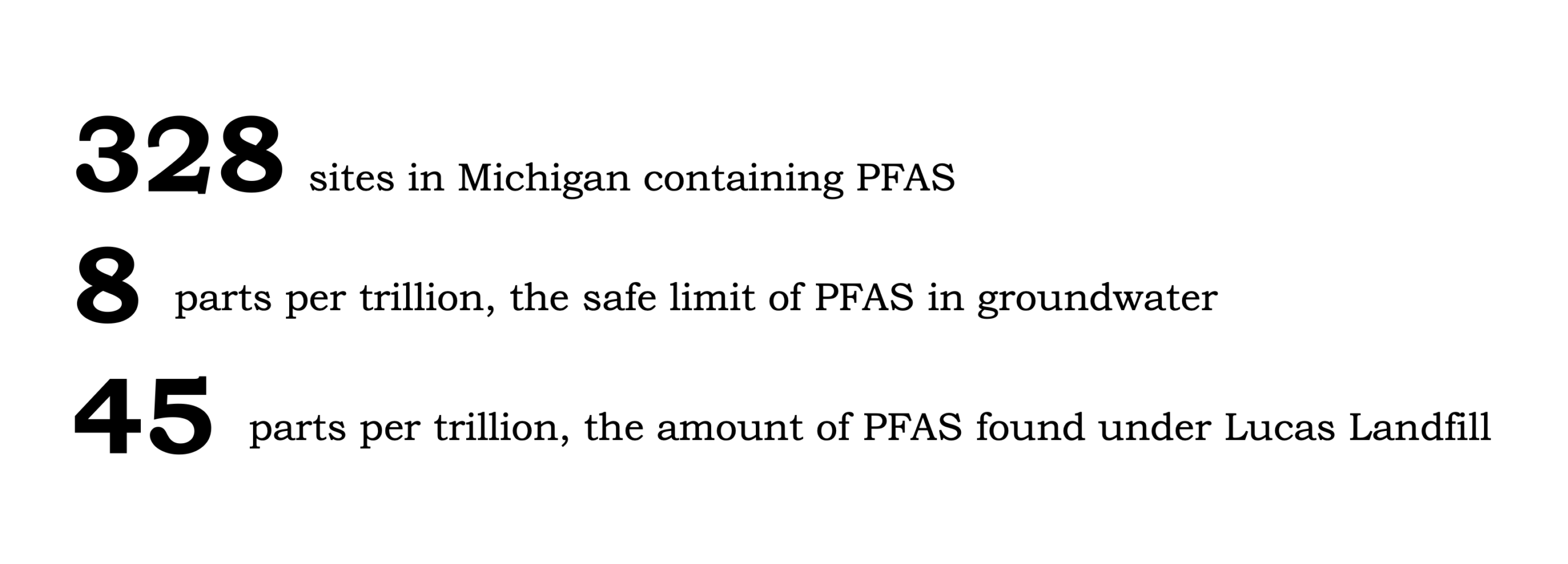 Between 2022 and 2024, EGLE tests at the landfill site reported PFAS concentrations in the groundwater beneath the landfill exceeding safe levels. They found the water contained 45 units of PFOA, a specific type of PFAS, for every trillion units of water, or 45 parts per trillion. This is well above the safety criteria of 8 parts per trillion set by EGLE.