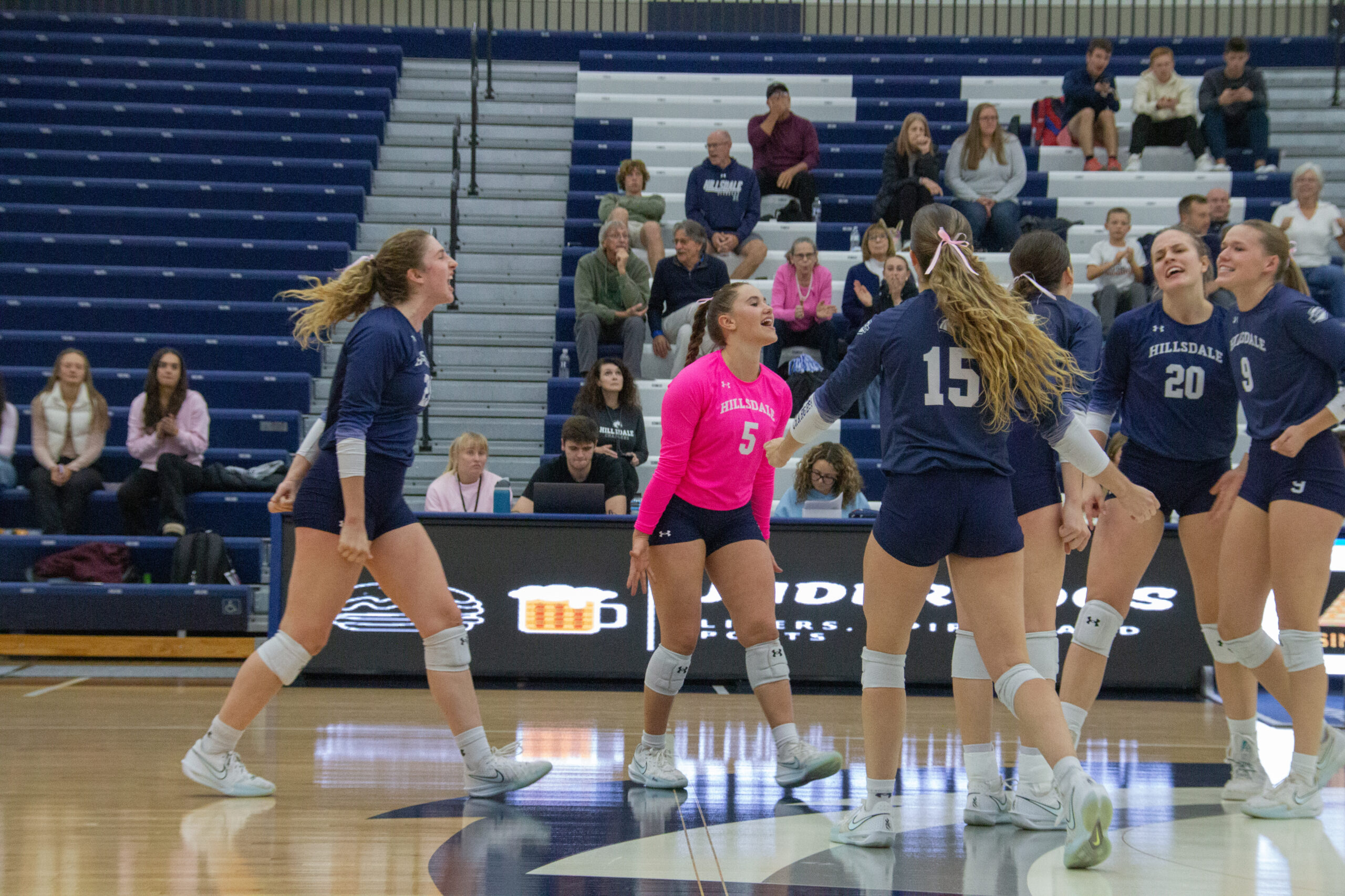 The Hillsdale volleyball team swept Walsh University in the Great Midwest Athletic Conference Tournament quarterfinal match Nov. 18 in Ohio, after losing a 3–2 set match against Tiffin University Nov. 14, and taking a 3–2 set win against University of Findlay Nov. 15.