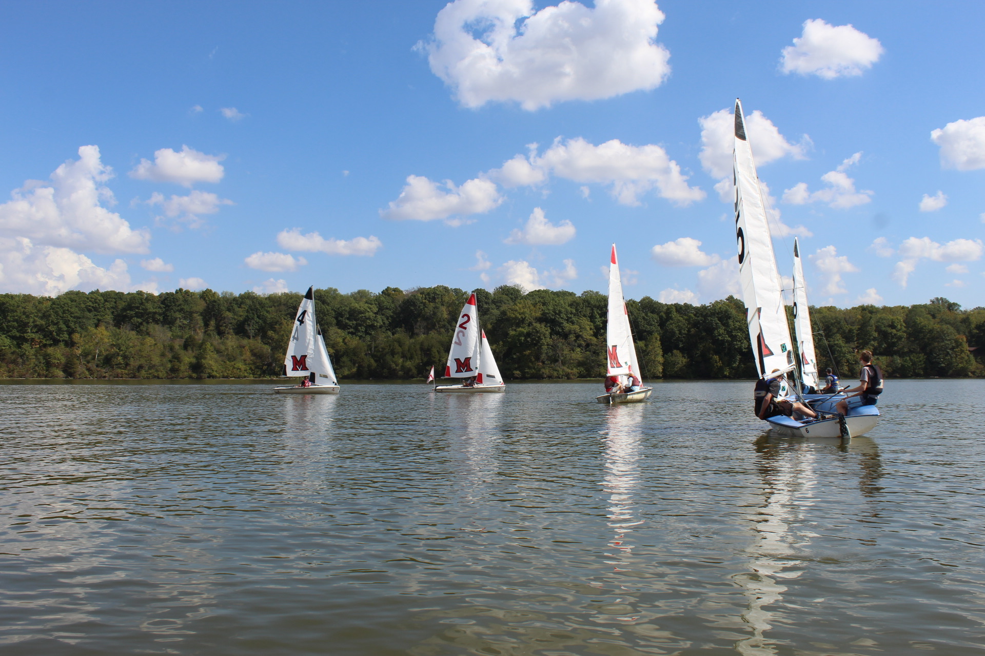 The sailing club meets in the early fall and late spring on Baw Beese Lake to practice sailing and racing in two 14-foot sailing dinghies.