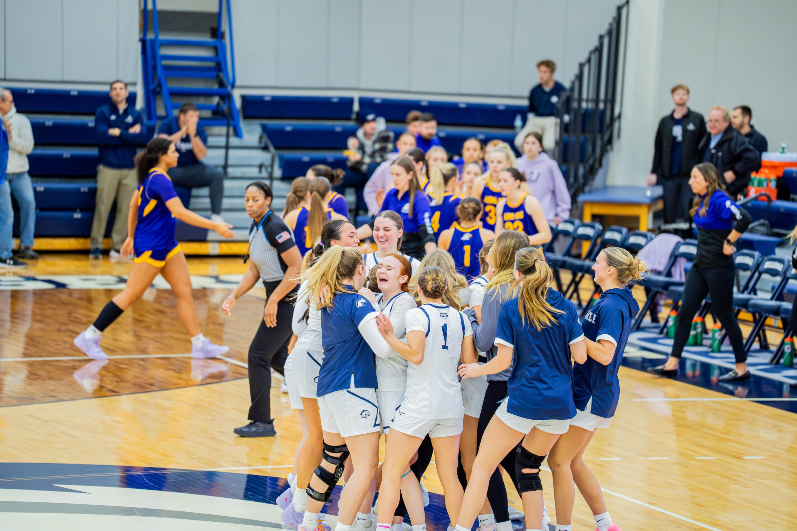 The Hillsdale women’s basketball team celebrates after beating Ashland University for the first time since 2014