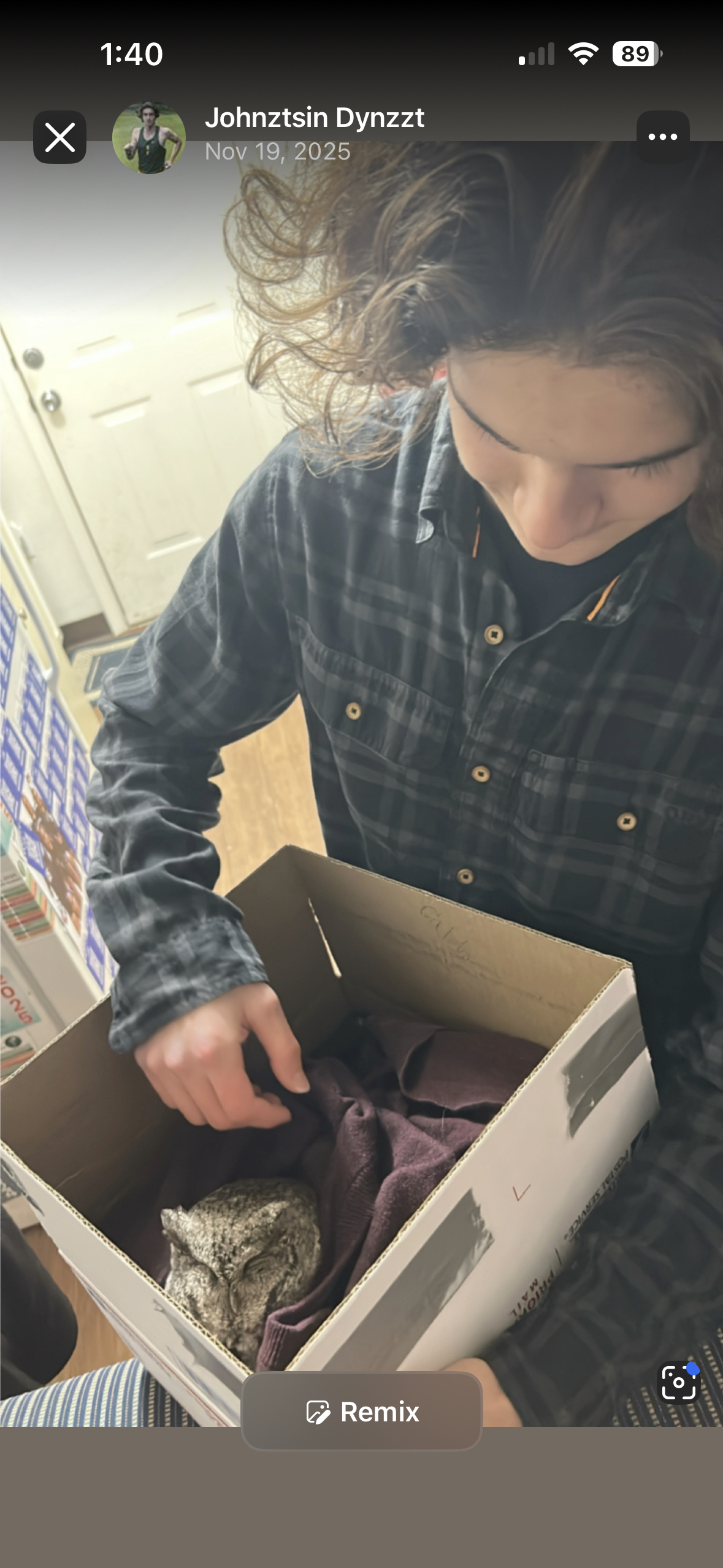 “We brought a cardboard box and a blanket, grabbed the owl, put it in the box on top of the blanket, wrapped a shirt around it and carried it back to the Suites like that,” Ahrabi said.