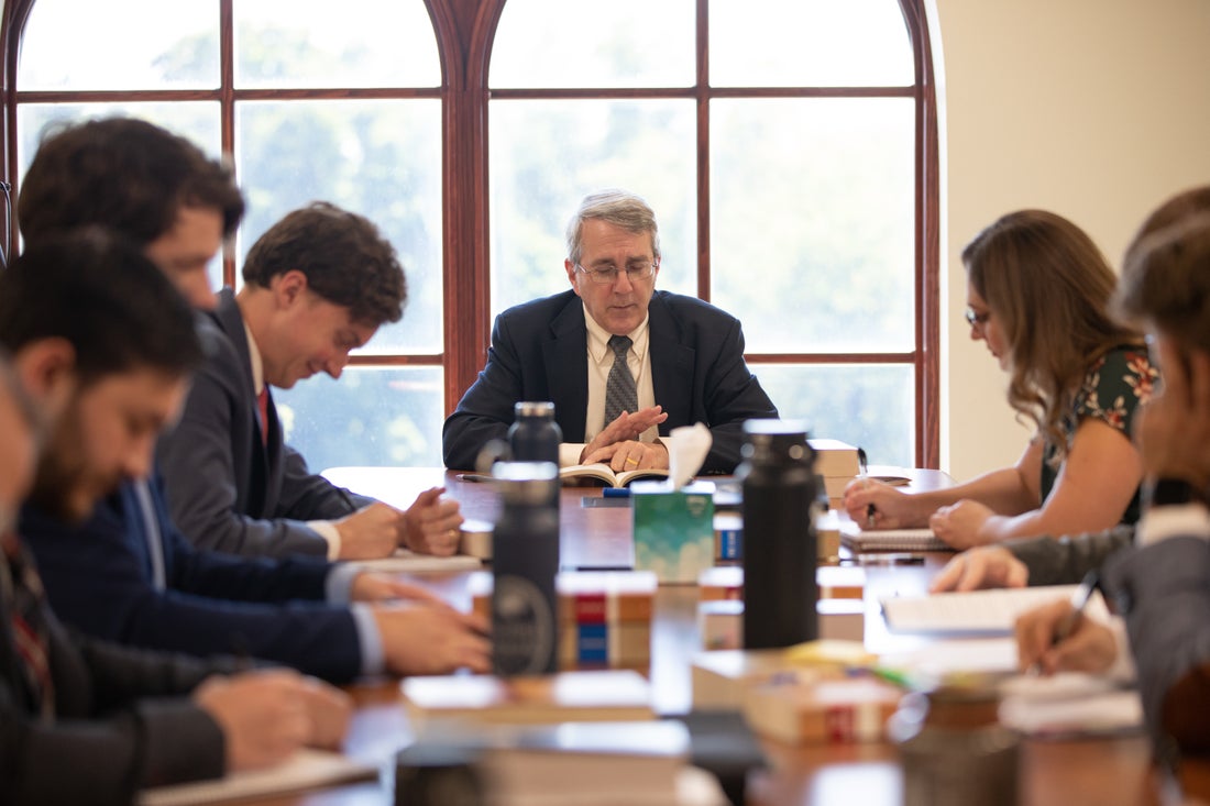 Professor of English David Whalen and graduate students of the classical education residential program convene in a classroom. Courtesy | Sara Gillett