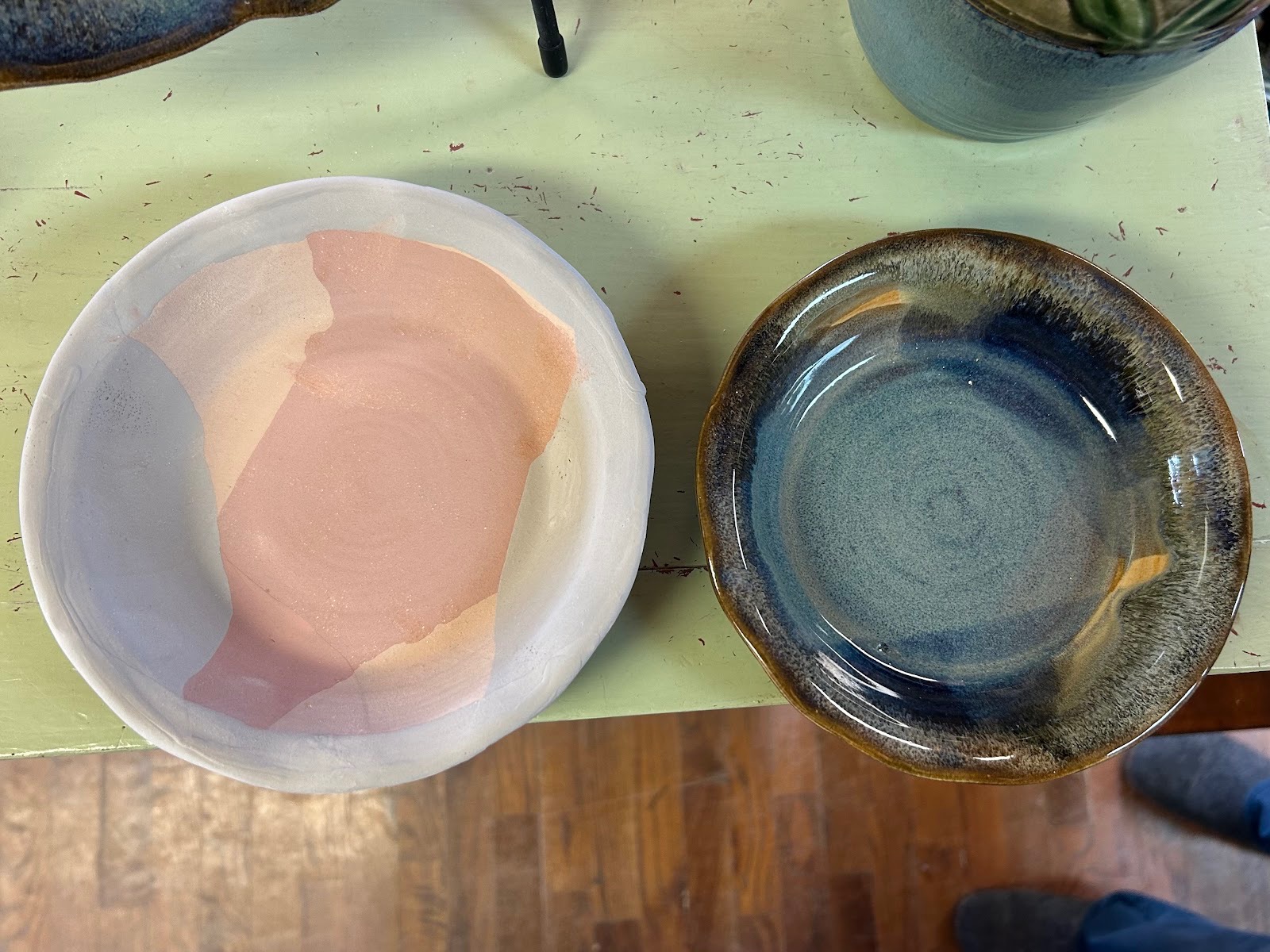 The studio is filled with shelves scattered with bisqueware and greenware waiting to be finished. After the pieces have been glazed, they are fired again at around 2,000 degrees, which melts the minerals inside the glaze and changes its color. The whole process takes about three days.