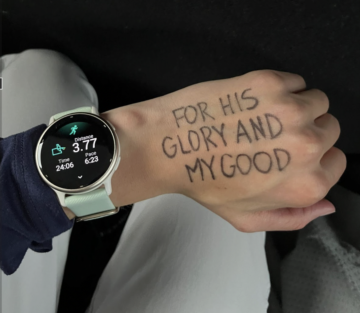 Roberts said she typically writes one of two things on her hand: “Run the Race,” an idea from Hebrews 12:1-2, or “For his glory and my good.”